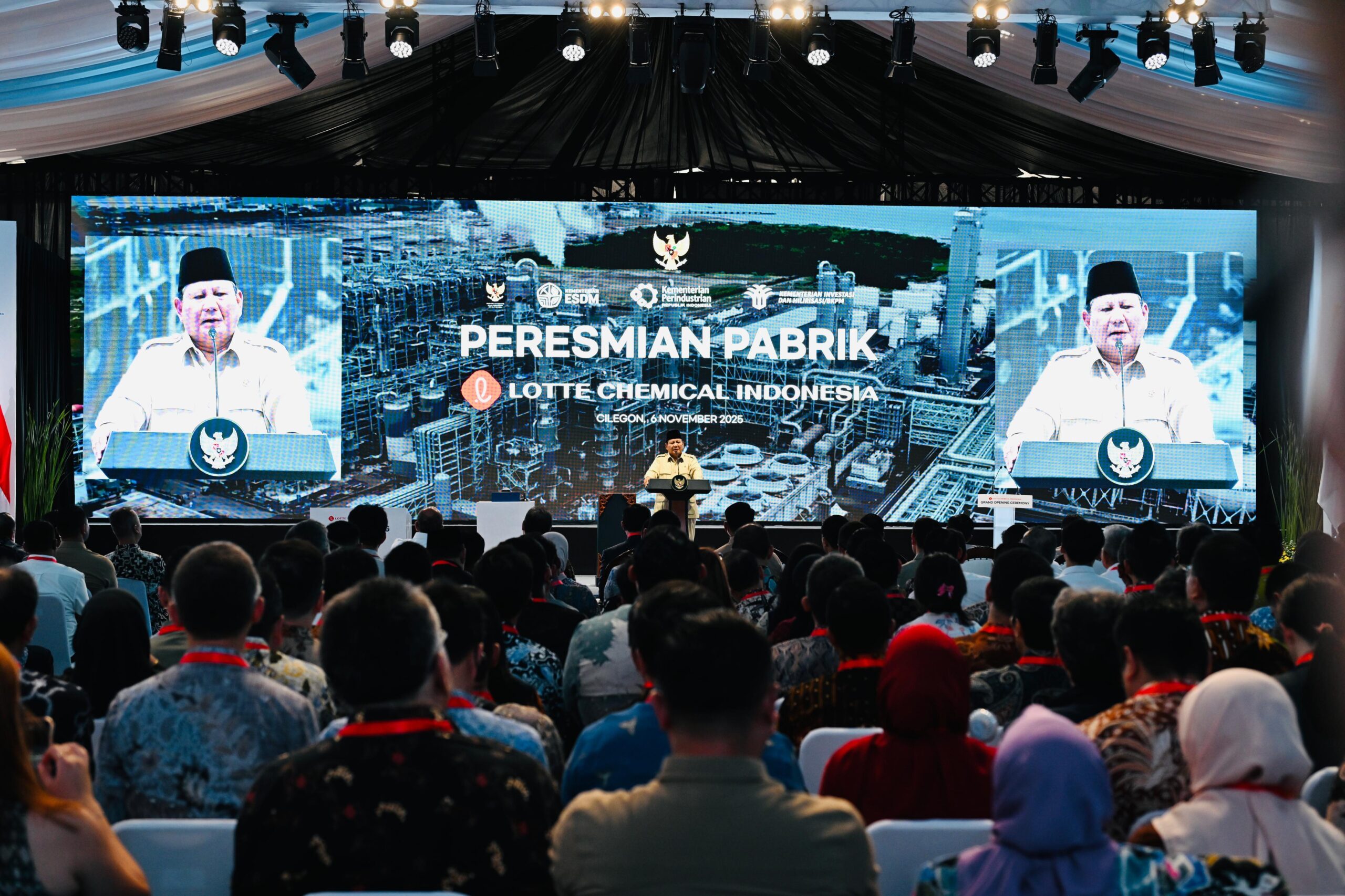 Cilegon, 6 November 2025 — Presiden Republik Indonesia Prabowo Subianto meresmikan pabrik petrokimia terintegrasi PT Lotte Chemical Indonesia (LCI) di Cilegon, Banten, Kamis (6/11). Peresmian ini turut didampingi Menteri Investasi dan Hilirisasi/Kepala BKPM Rosan Perkasa Roeslani, Menteri Energi dan Sumber Daya Mineral Bahlil Lahadalia, serta sejumlah menteri Kabinet Indonesia Maju.