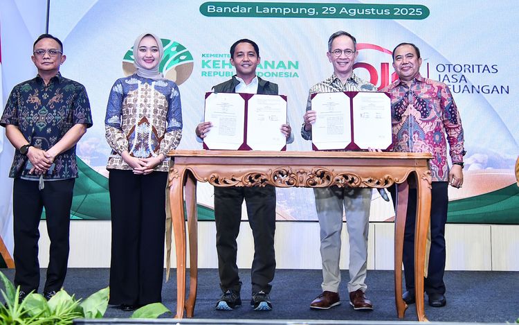 Penandatanganan Nota Kesepahaman dilakukan oleh Ketua Dewan Komisioner OJK Mahendra Siregar dan Menteri Kehutanan Raja Juli Antoni, di Bandar Lampung, Jumat (29/08). Penandatanganan Nota Kesepahaman ini merupakan bagian dari rangkaian Kick-off Pengenalan Pengembangan Potensi Nilai Ekonomi Karbon Perhutanan Sosial di Indonesia.