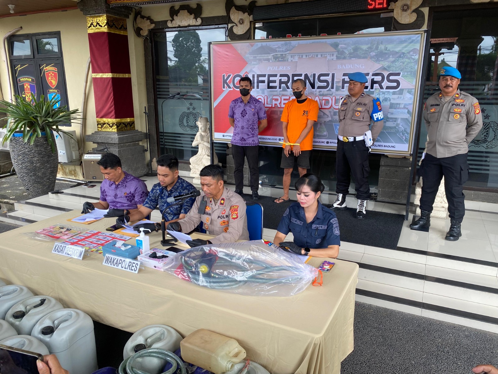 Mangupura – Polres Badung berhasil mengungkap praktik penyelewengan Bahan Bakar Minyak (BBM) bersubsidi jenis Pertalite yang dilakukan seorang pria berinisial AR (43), warga asal Jawa Timur yang berdomisili di Tabanan. Pelaku ditangkap di salah satu SPBU di wilayah Cemagi, Kecamatan Mengwi, Kabupaten Badung, setelah kedapatan memodifikasi kendaraan dan menggunakan barcode palsu untuk membeli BBM bersubsidi secara berulang. Dalam penangkapan tersebut, polisi mengamankan mobil Kijang Super, puluhan jerigen, mesin pompa, uang tunai, serta 22 lembar barcode Pertamina.